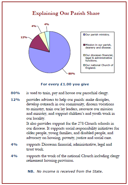 This is the diocesan summary of how our money is spent. As you can see 80% of it goes to ensuring our churches have vicars that are trained, paid and housed. It costs an estimated £50,000 a year to support one full time vicar. If parishes are unable to raise this sum themselves annually, increasingly the diocese is having to combine enough parishes together into a single benefice which can support a vicar between them.